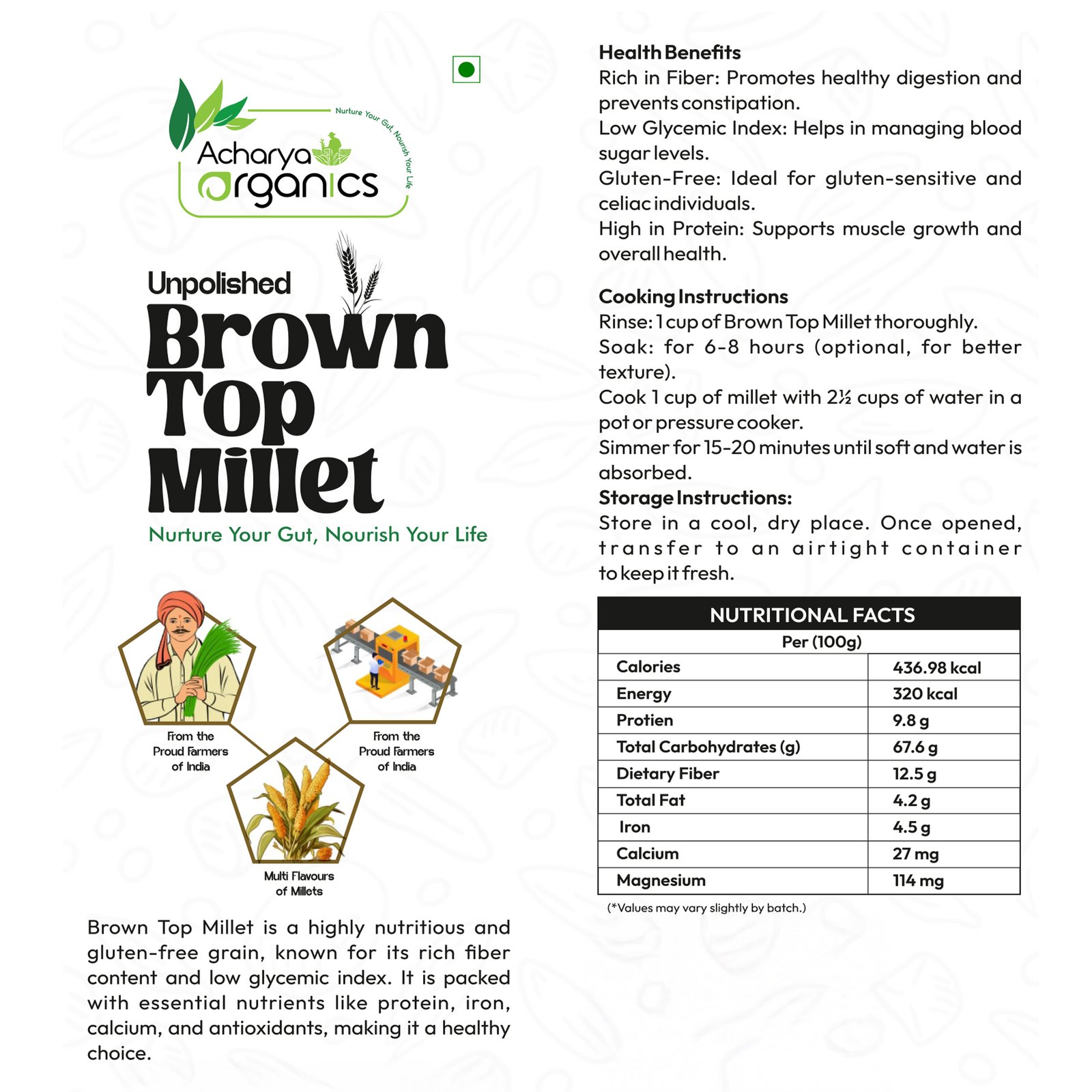 Blown Top Millet is a small-grained ancient superfood celebrated for its high nutrition and easy digestibility. Packed with dietary fiber, iron, and antioxidants, it supports heart health, manages weight, and keeps blood sugar in control. With its mild taste and versatility, Blown Top Millet can be used in porridge, pulao, upma, dosa, or even baked snacks—making it an excellent choice for a balanced diet.